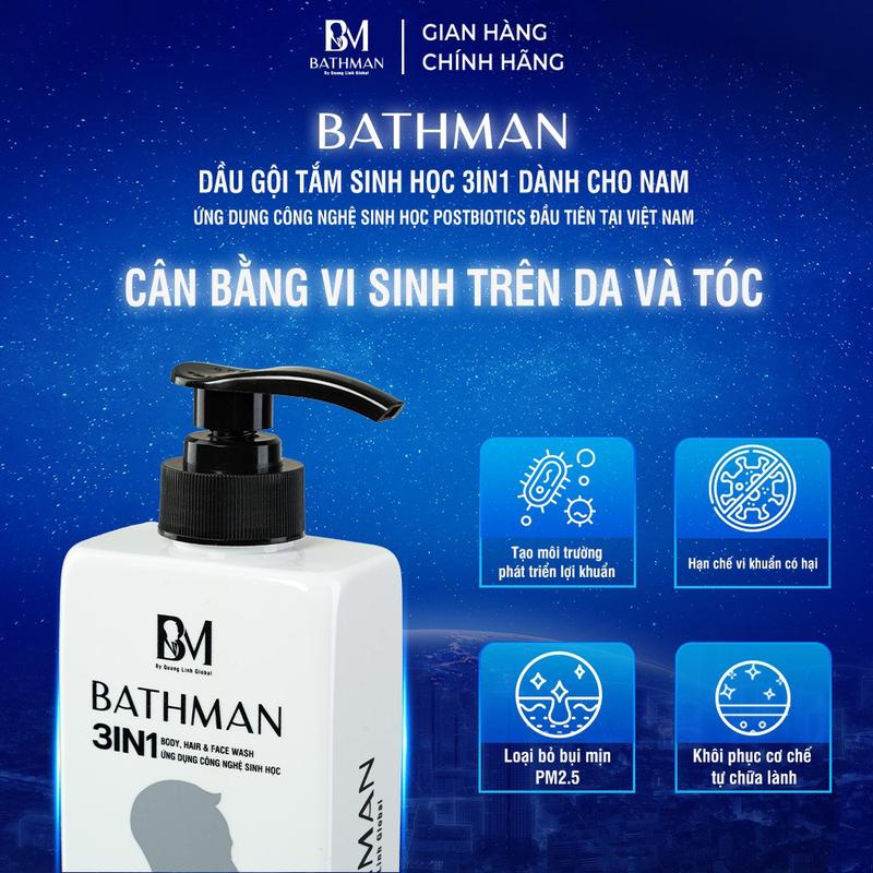 Sản phẩm dầu gội tắm sinh học 3in1 dành cho nam BATHMAN với công thức ưu việt kết hợp sữa tắm, sữa rửa mặt và dầu gội, mang lại sự tiện lợi, hương thơm lôi cuốn, làm sạch sâu, cân bằng hệ vi sinh trên da, dưỡng tóc chắc khỏe.