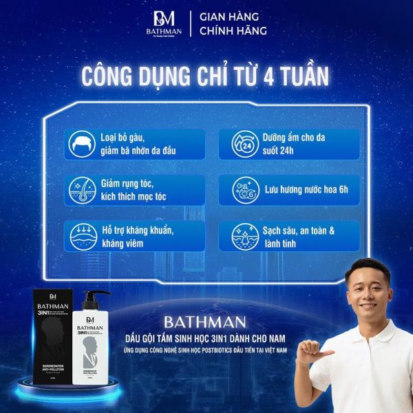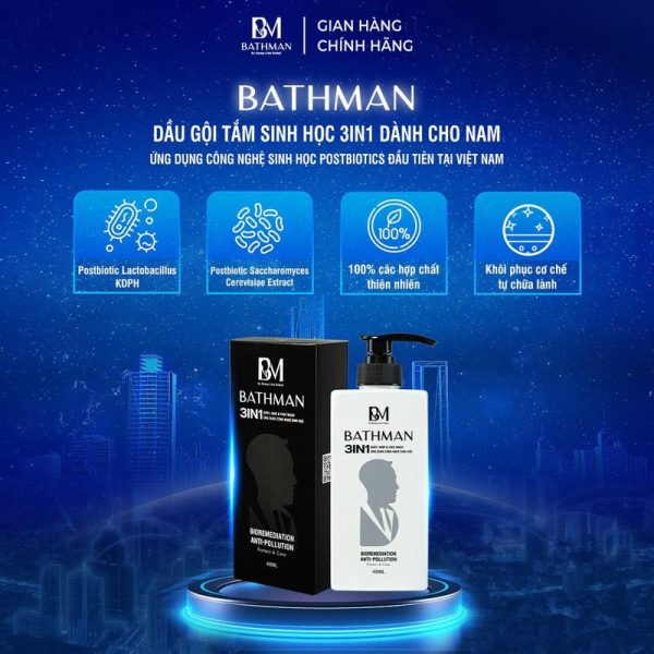 Sản phẩm dầu gội tắm sinh học 3in1 dành cho nam BATHMAN với công thức ưu việt kết hợp sữa tắm, sữa rửa mặt và dầu gội, mang lại sự tiện lợi, hương thơm lôi cuốn, làm sạch sâu, cân bằng hệ vi sinh trên da, dưỡng tóc chắc khỏe.