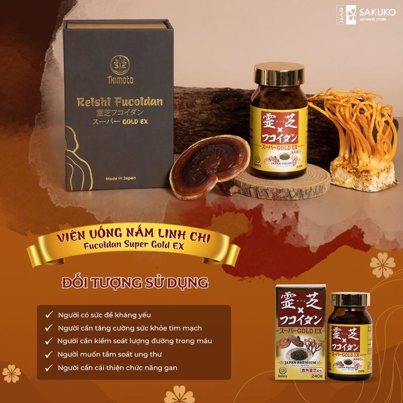 hợp độc đáo giữa các thành phần, sản phẩm này giúp tăng cường miễn dịch và chăm sóc sức khoẻ toàn diện. Tăng Cường Miễn Dịch – Kiểm Soát Huyết Áp – Sức Khỏe Não Bộ Sản phẩm này có chứa thành phần fucoidan, có khả năng kích hoạt tế bào miễn dịch và giúp duy trì một hệ thống miễn dịch khỏe mạnh. Ngoài ra, Viên Nấm Linh Chi Fucoidan Super Gold Ikimoto còn được bổ sung vitamin tổng hợp và giàu dinh dưỡng để duy trì sự khỏe mạnh của các tế bào não. Trao Đổi Chất – Sức Khỏe Tim Mạch Sản phẩm này không chỉ giúp kiểm soát huyết áp mà còn có lợi ích cho tim mạch. Thành phần của Viên Nấm Linh Chi Fucoidan Super Gold Ikimoto là hoàn toàn thiên nhiên và không chứa đường